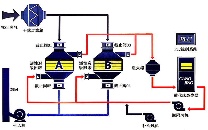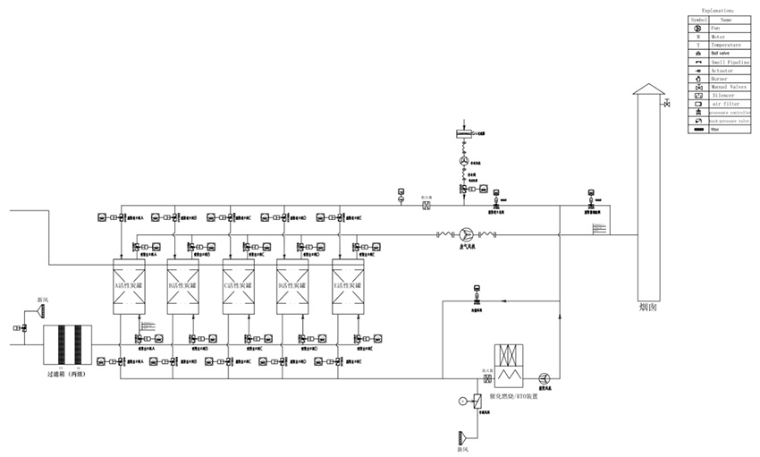本凈化裝置采用雙氣路連續(xù)工作,設(shè)兩個(gè)或多個(gè)吸附床可交替使用,先將有機(jī)廢氣用活性炭吸附,當(dāng)快達(dá)到飽和時(shí)停止吸附操作,然后用熱氣流將有機(jī)物從活性炭上脫附下來(lái)使活性炭再生;脫附下來(lái)的有機(jī)物已被濃縮并送入催化燃燒室轉(zhuǎn)化成CO2和H2O排出,當(dāng)有機(jī)廢氣濃度合適的情況下,有機(jī)廢氣可維持自燃,不用外加熱,燃燒后的尾氣一部分排入大氣,大部分送往吸附床,用于活性炭的脫附再生。這樣能滿足燃燒和脫附所需的熱能,達(dá)到節(jié)能的目的,再生后的活性炭也可用于下次吸附。裝置既適合于連續(xù)操作,也適合于間斷操作。