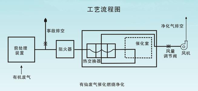 本裝置是利用催化劑做中間體,使有機氣體在較低的溫度下燃燒、生成無害的二氧化碳和水蒸氣排放。反應(yīng)方程式: